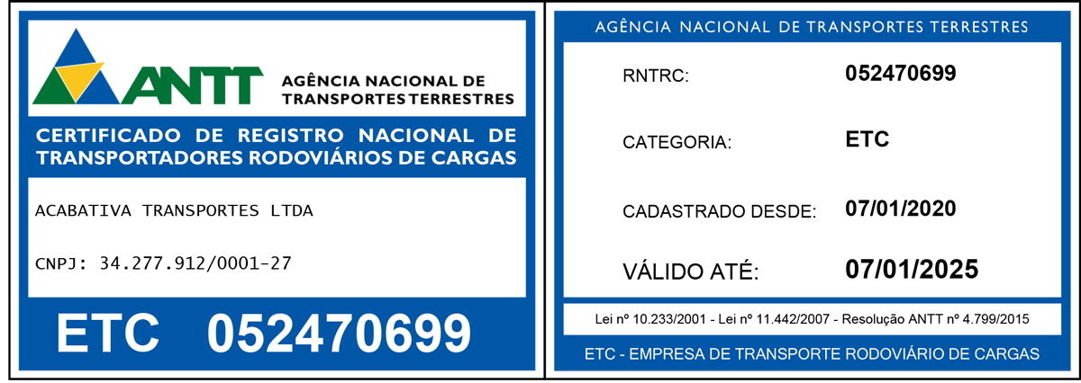 Acabativa conta com frota própria e agregada e galpão com 650m² com estrutura porta paletes com mais de150 posições, pessoal altamente especializado em operações de transporte de carga seca para todo o Brasil. Temos veículos de todos os tipos e tamanhos, como caminhões baú de pequeno, médio e grande porte, adequados para atender a todas as necessidades de nossos clientes. Nosso transporte é feito com seguro garantido pela PORTO SEGURO S/A.